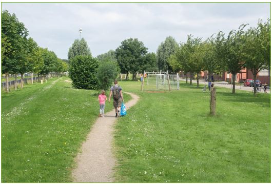 ‘Soms is het stil in de wijk. Kom je op die groenstrook, dan zie je mensen zitten, wandelaars, joggers. Het is een levendige ader door de buurt. Mensen moeten hier hun hond aangelijnd houden en langs de strook lopen. Daarom is het hier ook schoon. Ik merk dat de kinderen liever hier spelen dan elders in de wijk, ook mijn kinderen.’