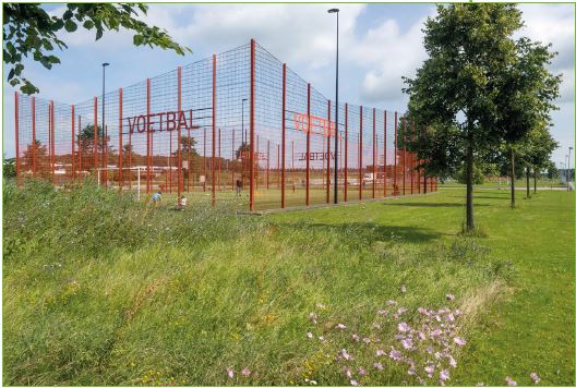 ‘Juist door die opvallende kleur ga je daar naar toe. Er staan drie kooien: één voor tennis, één voor basketbal en één voor voetbal. Door de kooien eromheen, komen de ballen niet steeds op de weg. Zo heeft niemand er last van. Om de skatebaan zit geen hek, dat hoeft niet.’