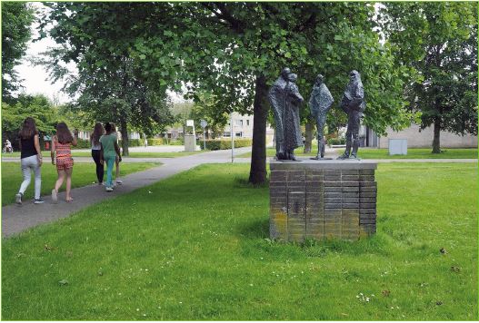 ‘Als ik met mijn rug naar het beeld stond, kon ik drie pleinen goed overzien. Het schoolplein, een speelplantsoen en een basketbalveld.Keerde ik die hectiek de rug toe,dan voelde ik me bijna deelgenoot van dat groepje. Voor mij zijn het drie mannen en een vrouw. Het lijken oude filosofen die de omstandigheden van de dag, de week tot en met het heelal aan toe met elkaar doorspreken. Al kan het ook een roddelgroepje zijn, en alles wat daartussen zit.’