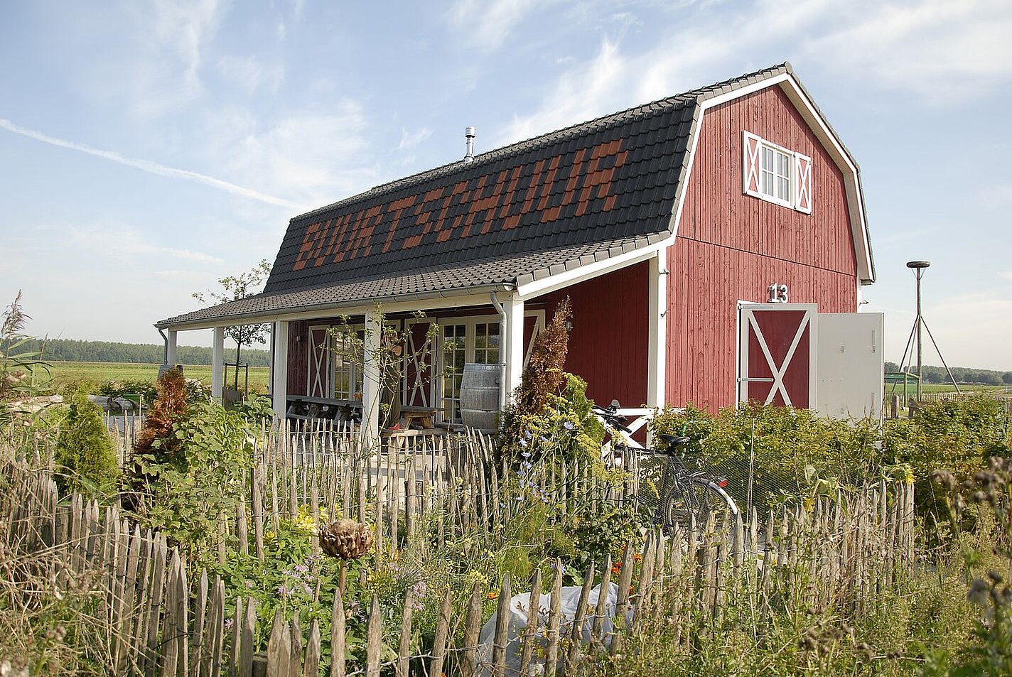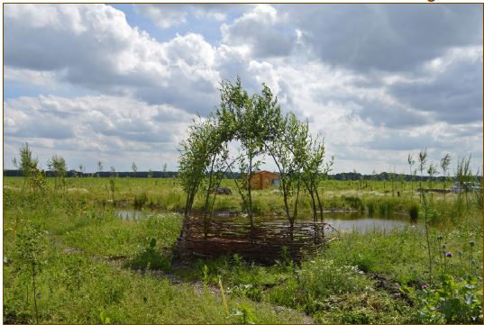 Hun tienerdochter vlocht een wilgenhut met een wilgenbankje, van waaruit je uitkijkt op de vijver en hun tuinhuisje. Een simpele blokhut voor het gereedschap, twee stretchers en een waterkoker. ‘Alle wilgen die in de grond zijn gestoken, lopen uit. Je zit in een levend hutje. Als ik daar zit en mijn ogen dichtdoe, zie ik ons huis, verzonken in dit mooie landschap.’