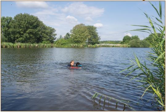 Molly Mae houdt van zwemmen, maar Saskia moet haar wel over een drempel heen helpen. ‘Als ik ’s zomers met wetsuit het water in ga, springt ze er gelijk in. We gaan dan waterwerken, reddingszwemmen voor honden. Ze trekt mij naar de kant, ik hang aan haar tuig.’
