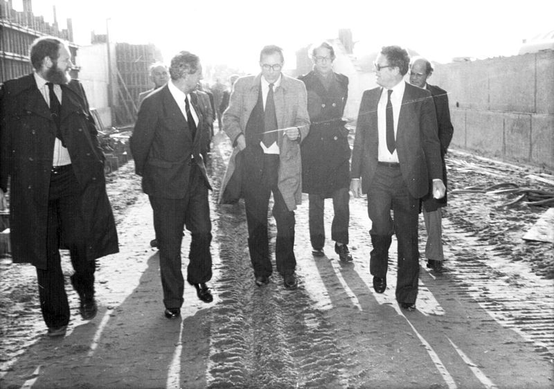 In november 1978 gaat de bouw van Almere Stad officieel van start. Een aantal genodigden, waaronder ir. D. Tuijnman, minster van Verkeer en Waterstaat (tweede van links), oud-burgemeester Han Lammers (derde van links) en prof. Duin, directeur Rijksdienst voor de IJsselmeerpolders (2e van rechts) maakt op 7 november een wandeling over het bouwterrein. Als officiële handeling wordt een betonvloer gestort van Meerestein, het kantoor van de RIJP.