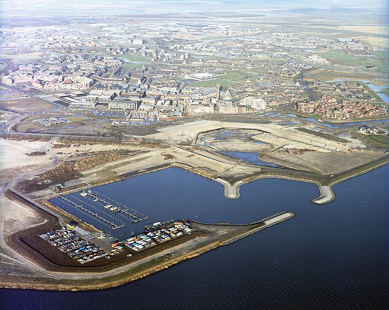 Almere Haven is de eerste kern van Almere. In 1976 trokken de eerste bewoners in hun huizen. Wat niet iedereen weet is dat Almere Haven de eerste jaren helemaal geen haven had! Op deze luchtfoto uit circa 1980 van Delta-Phot zien we de aanleg van de binnenhaven. Eerst werd buitendijks een stuk land opgespoten en een buitenhaven gemaakt. De jachthaven is al in gebruik. De kaarsrechte dijk wordt omgelegd en er wordt gewerkt aan de binnenhaven.