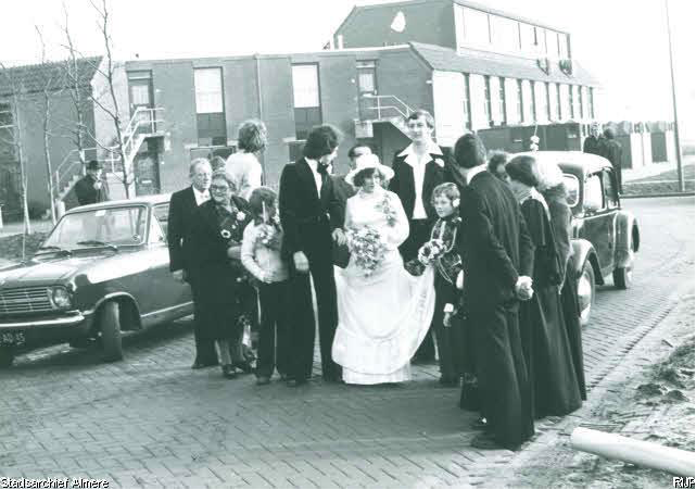 Het eerste huwelijk in Almere vond plaats op 21 januari 1977. Op de foto zien we bruidegom Fred Broekhuijzen en bruid Louise Langenberg samen met een gezelschap in Almere Haven. Nog net te zien is een Citroën oldtimer waarin ze werden vervoerd.