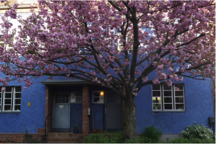 De bedenker van de buurt, Hans Laumanns, genoot tijdens zijn studietijd in Berlijn elk jaar weer van de roze ‘Kirschblüte’ tegen de achtergrond van huizen in terracotta, geel en de, volgens Floor van Dusseldorp meest sprankelende kleur: ‘Taut-blau’ (ultramarijn).