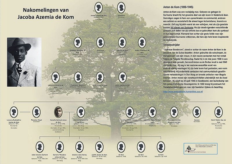 De oudste stamboom in de tentoonstelling gaat terug tot de 17de eeuw. Een van de bekendste namen is wel Anton de Kom, zoon van een slaafgemaakte en een bekende verzetsstrijder in Nederland tijdens de tweede Wereldoorlog. Ook zijn stamboom is uitgeplozen en in de tentoonstelling te zien. Een andere bekende familie is de familie Nods – die ook verzetswerk verrichtte. Waldy Nods speelt de hoofdrol in het boek Sonny Boy, geschreven door Annejet van der Zijl en verfilmd door Maria Peters. Maar er zijn ook stambomen van minder bekende families, die een interessante inkijk bieden in de levens van de Surinaamse voorouders.