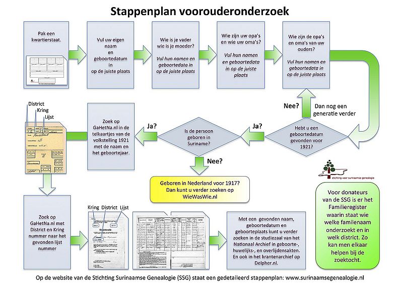 Voor stamboomonderzoek naar Surinaamse voorouders kunt u terecht in het Nationaal Archief in Den Haag. Daar worden veel geboorte-, huwelijks- en overlijdensaktes bewaard, waarin veel informatie over voorouders te vinden is. De slavenregisters uit het Nationaal Archief van Suriname zijn ook een belangrijke bron, deze zijn online raadpleegbaar. Surinaamse kranten zijn doorzoekbaar op de site van de Koninklijke Bibliotheek: Delpher.nl