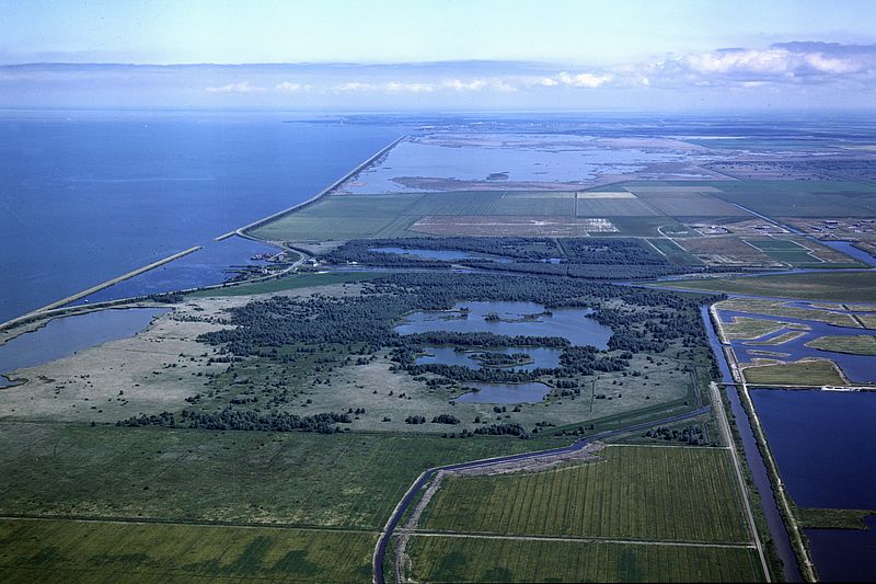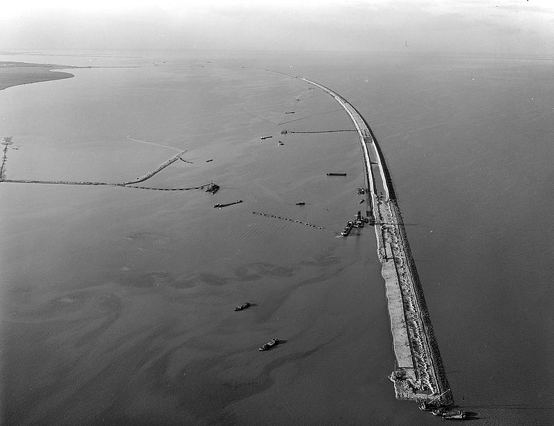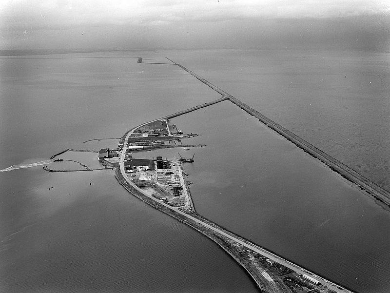 Er zit een mooi verhaal aan deze foto’s van De Blocq van Kuffeler. Bij de aanleg van de polder werd er van uitgegaan dat ook de Markerwaard drooggelegd zou worden. Er zouden twee dijken komen, met een kanaal ertussen. Op de oude foto’s (rechts bij de bouw, genomen in de richting Oostvaardersplassen, en links genomen richting Pampushout) is te zien dat het gemaal op de dijk van de Flevopolder ligt. De dijk die we zien, en waar je tegenwoordig over rijdt, was dus eigenlijk bedoeld voor de Markerwaard. Een polder die er, na protesten, nooit is gekomen. Dat verklaart de vreemde slinger in de dijk bij het gemaal en verderop nog een keer.