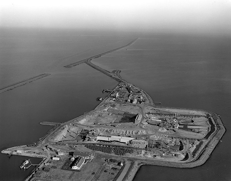 Dit is waarschijnlijk de eerste foto van Almere. Bij het samenstellen van de tentoonstelling Almere Boven werd deze foto herontdekt in het archief van fotograaf Bart Hofmeester. Vanuit dit werkeiland aan de huidige Oostvaardersdijk is Zuidelijk Flevoland drooggelegd en Almere ontstaan. Na het sluiten van de dijken start op 10 oktober 1967 het leegpompen van de polder met vier enorme dieselpompen in het gemaal De Blocq van Kuffeler. De boten in de verte, zijn die aan het vissen, of baggeren ze de Hoge en Lage Vaart uit?