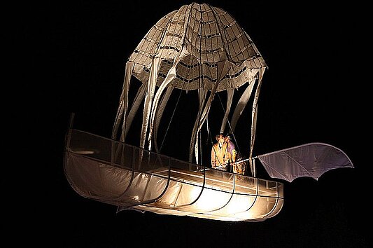 Als Larry zijn eerste vliegreis maakt, komt opeens in hem op dat vliegen niets voor mensen is. Hij krijgt allerlei visioenen, die het publiek meevoeren op een wonderlijke reis door de tijd, waarin luchtreizen centraal staat. En de menselijke hoogmoed. Het decor voor deze voorstelling bestaat uit een stellage van bogen, waaraan diverse mensen en objecten door de lucht ‘vliegen’.