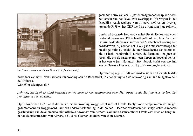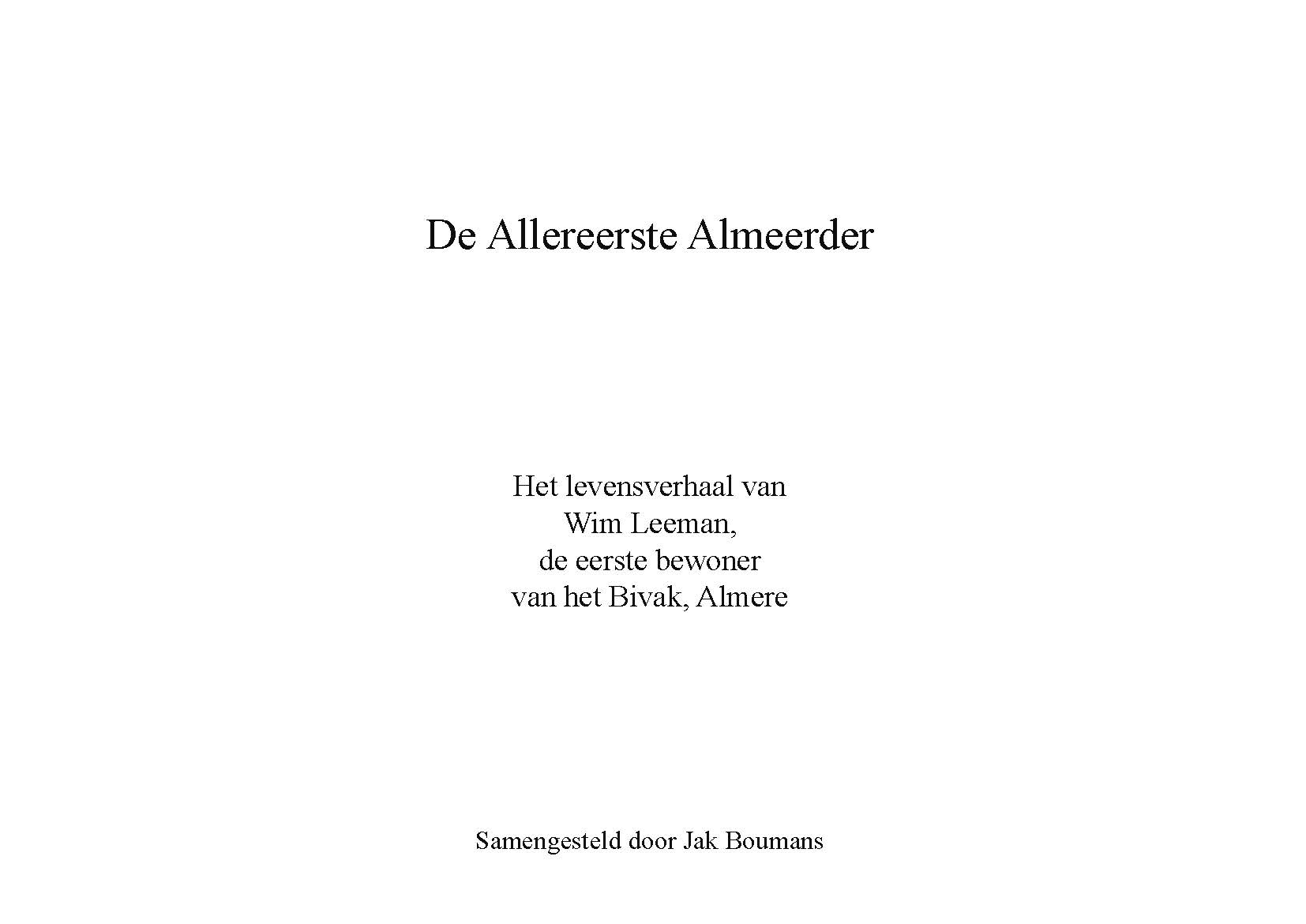 Wim Leeman was politieagent in Almere en woonde vanaf 1 december 1975 in het Bivak, in een van de acht tijdelijke, houten woningen in Almere Haven. In de serie Levensboek van Humanitas Almere beschrijft Jak Boumans het levensverhaal van deze 'Allereerste Almeerder' en gaat daarnaast in op de geschiedenis van het Bivak.