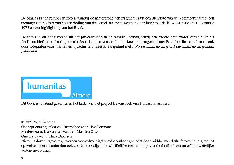 Humanitas Levensboek is er voor iedereen die zijn of haar levensverhaal op papier wil zetten maar dit niet zelf kan of wil schrijven. De afgelopen jaren zijn samen met vrijwilligers van Humanitas Almere bijna 100 levensboeken gemaakt. De boeken worden gemaakt voor de geportretteerden zelf en zijn niet te koop. Het levensboek van Wim Leeman is de eerste uit de serie die ook als e-book wordt uitgegeven. Lees meer over het Levensboek op de website van Humanitas