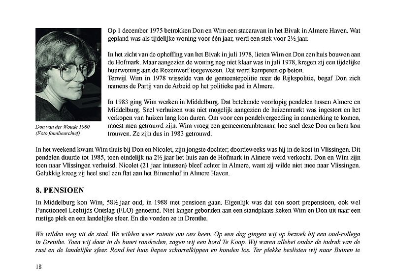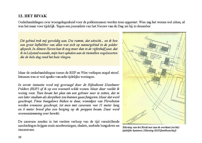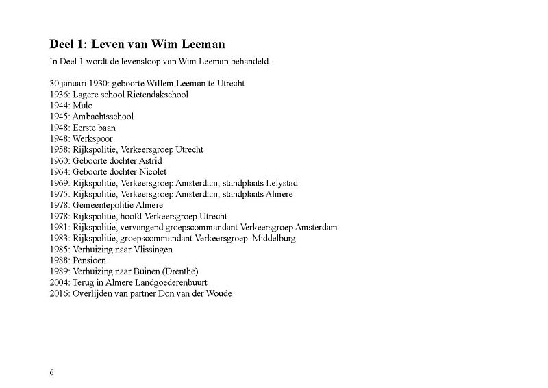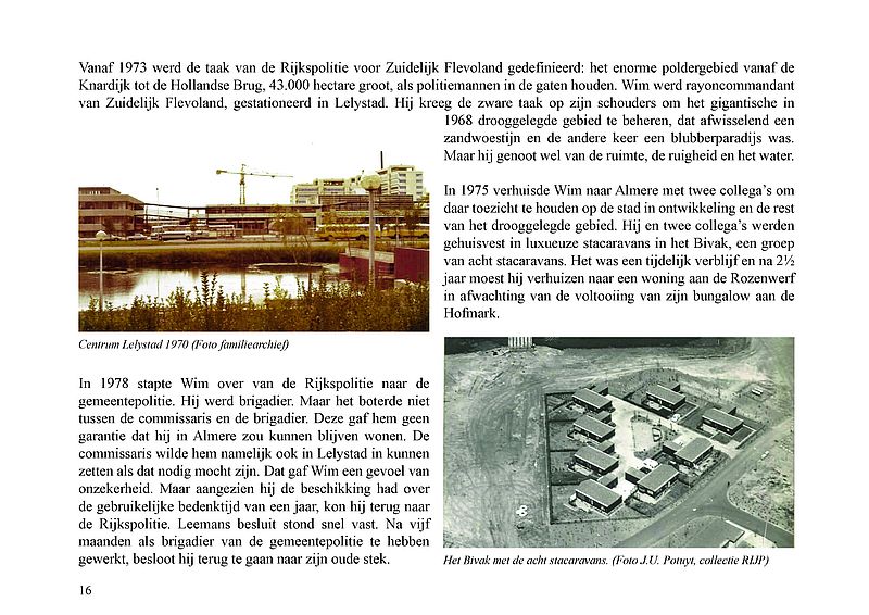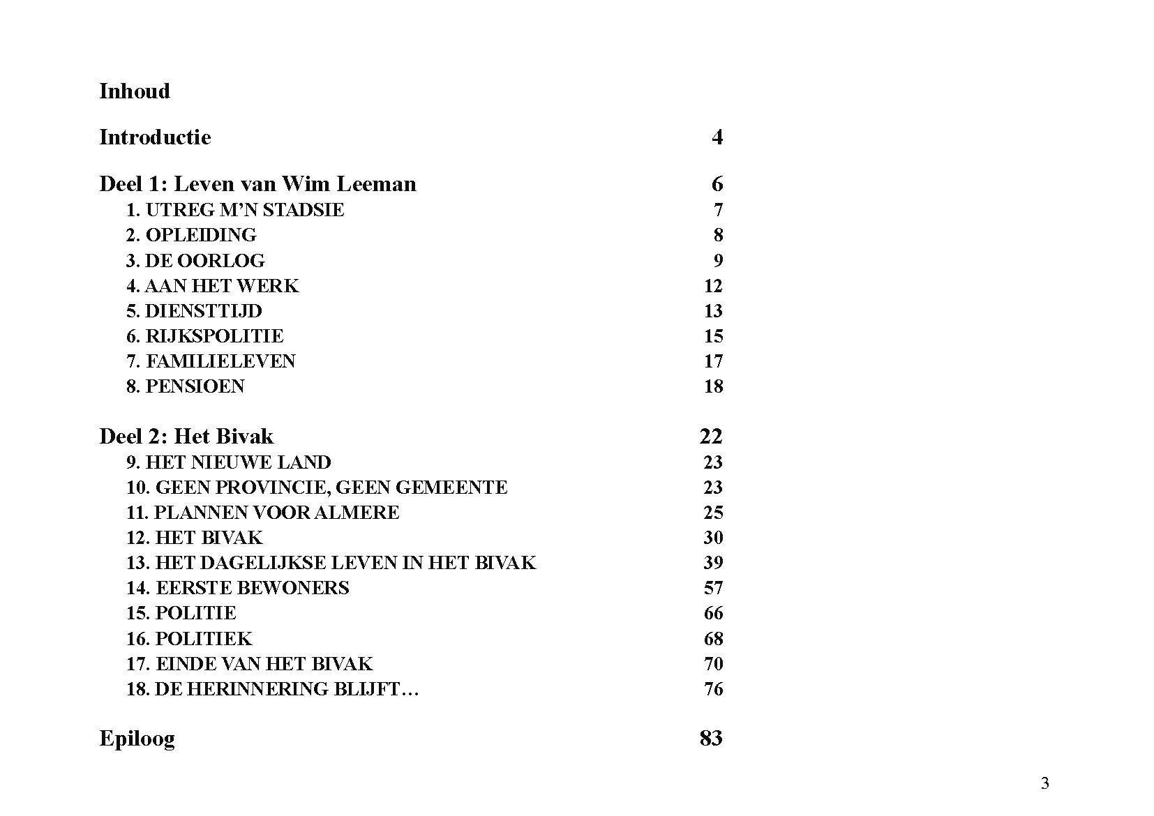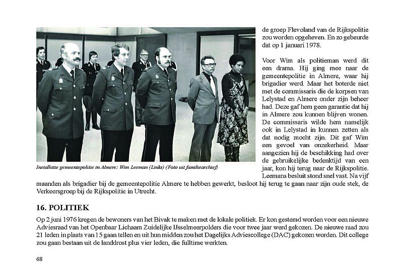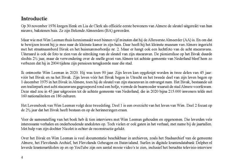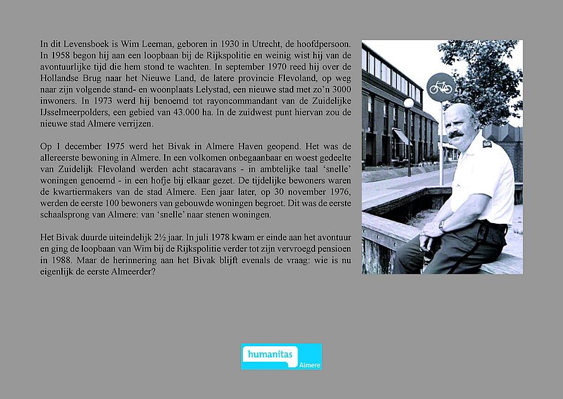 In dit Levensboek is Wim Leeman, geboren in 1930 in Utrecht, de hoofdpersoon. In 1958 begon hij aan een loopbaan bij de Rijkspolitie. In september 1970 was zijn stand- en woonplaats Lelystad en vanaf 1975 Almere. Hij woonde vanaf 1 december 1975 in een tijdelijke woning, in het zogenaamde Bivak in Almere Haven. In juli 1978 kwam er einde aan het avontuur in het Bivak en ging de loopbaan van Wim bij de Rijkspolitie verder tot zijn vervroegd pensioen in 1988.