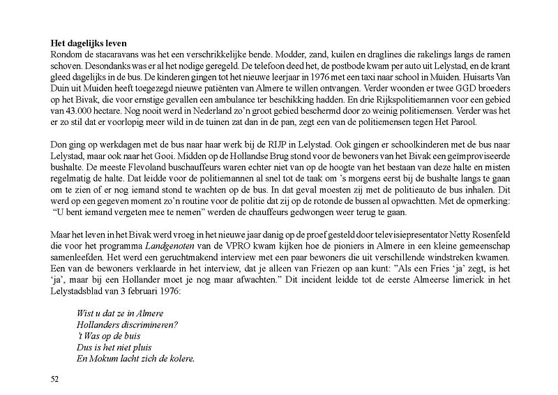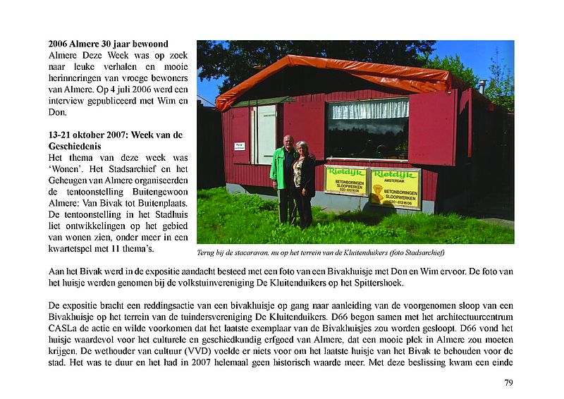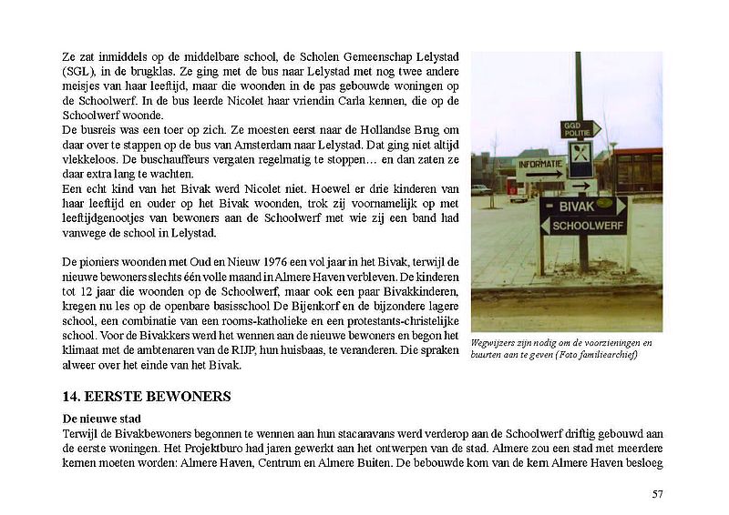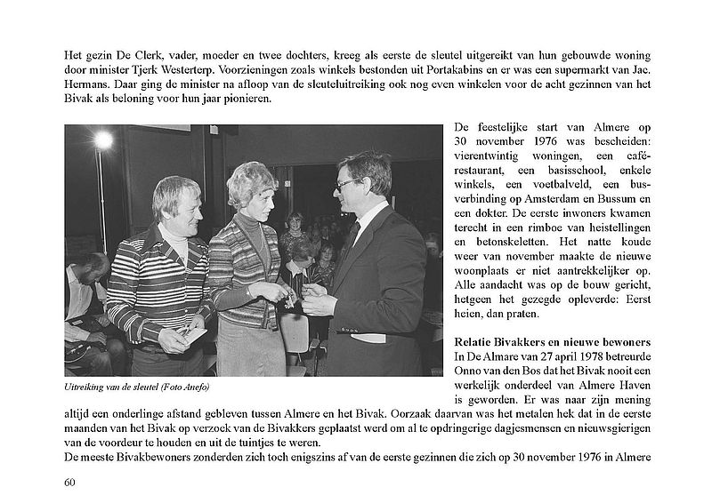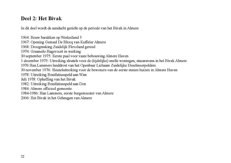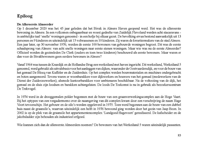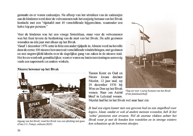 Op 1 december 1975 werd het Bivak in Almere Haven geopend. Het was de allereerste bewoning in Almere. In een volkomen onbegaanbaar en woest gedeelte van Zuidelijk Flevoland werden acht stacaravans – in ambtelijke taal ‘snelle’ woningen genoemd – in een hofje bij elkaar gezet. De bevolking ervan bestond aanvankelijk uit 13 personen en 9 kinderen en uiteindelijk uit 15 volwassenen en 10 kinderen. Zij waren de kwartiermakers van de stad Almere. Ze werkten onder andere bij de GGD, de PTT en de politie. Een jaar later, op 30 november 1976, werden de eerste 100 bewoners van gebouwde woningen begroet. Dit was de eerste schaalsprong van Almere: van acht snelle woningen naar eerste stenen woningen. Maar wie was nu de eerste Almeerder? Officieel worden de gezinsleden De Clerk (ouders en toen twee kinderen) beschouwd als eerste bewoners. Maar waren er dan voor de Bivakbewoners geen eerdere bewoners in Almere?