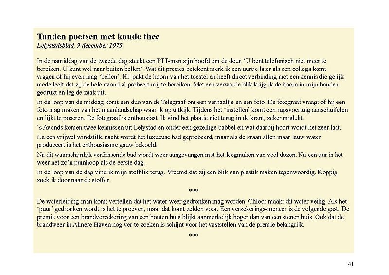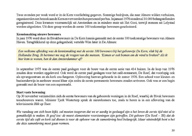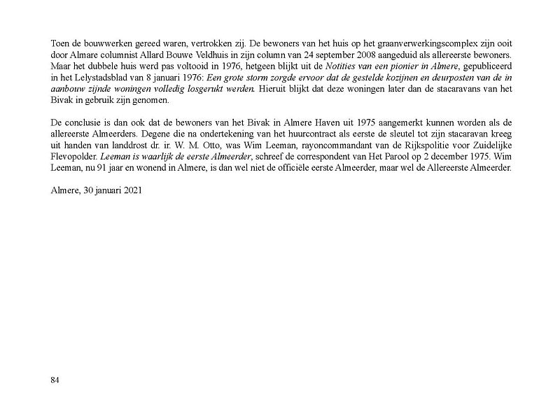In deze publicatie concludeert Jak Boumans dat, behalve de tijdelijke werklieden op het werkeiland bij De Blocq van Kuffeler, de bewoners van het Bivak in Almere Haven uit 1975 aangemerkt kunnen worden als de allereerste Almeerders. Degene die na ondertekening van het huurcontract als eerste de sleutel tot zijn stacaravan kreeg uit handen van landdrost dr. ir. W. M. Otto, was Wim Leeman, rayoncommandant van de Rijkspolitie voor Zuidelijke Flevopolder. Leeman is waarlijk de eerste Almeerder, schreef de correspondent van Het Parool op 2 december 1975. "Wim Leeman, nu meer dan 90 jaar oud en wonend in Almere, is dan wel niet de officiële eerste Almeerder, maar wel de Allereerste Almeerder", aldus Jak Boumans.